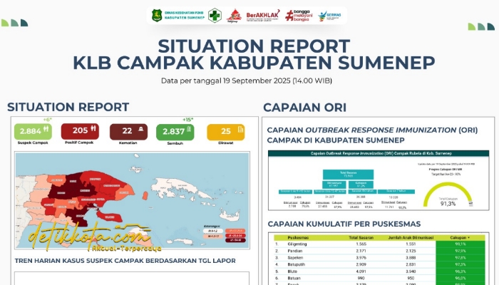 SUMENEP, detikkota.com – Dinas Kesehatan, Pengendalian Penduduk dan Keluarga Berencana (DKP2KB) Kabupaten Sumenep melalui 26 Puskesmas terus melaksanakan Outbreak Response Immunization (ORI) Campak Rubela (MR). Hingga hari ke-22, Jumat (19/09/2025) pukul 16.00 WIB, capaian imunisasi mencapai 67.557 anak dari total sasaran 73.969, atau 91,3 persen.
