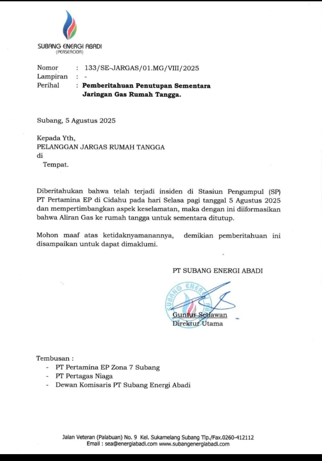 Menanggapi kondisi tersebut, Direktur Utama PT Subang Energi Abadi, Guntur Setiawan, mengeluarkan surat edaran resmi kepada seluruh pelanggan jaringan gas. Dalam surat tersebut, pihak perusahaan menyampaikan permohonan maaf sekaligus pemberitahuan mengenai penghentian sementara aliran gas rumah tangga demi alasan keselamatan.
