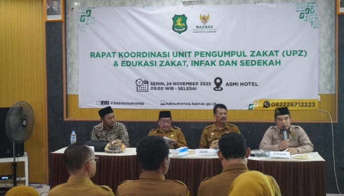 SUMENEP, detikkota.com – Baznas Kabupaten Sumenep menggelar rapat koordinasi (Rakor) bersama Unit Pengumpul Zakat (UPZ) se-Kabupaten Sumenep yang terdiri dari OPD, Puskesmas, Kecamatan, serta para pengawas SD dan SMP. Kegiatan ini bertujuan memperkuat pemahaman mengenai tugas dan fungsi UPZ dalam optimalisasi penghimpunan zakat, infak, dan sedekah (ZIS). Rakor dibuka langsung oleh Wakil Bupati Sumenep, KH. Imam Hasyim.
